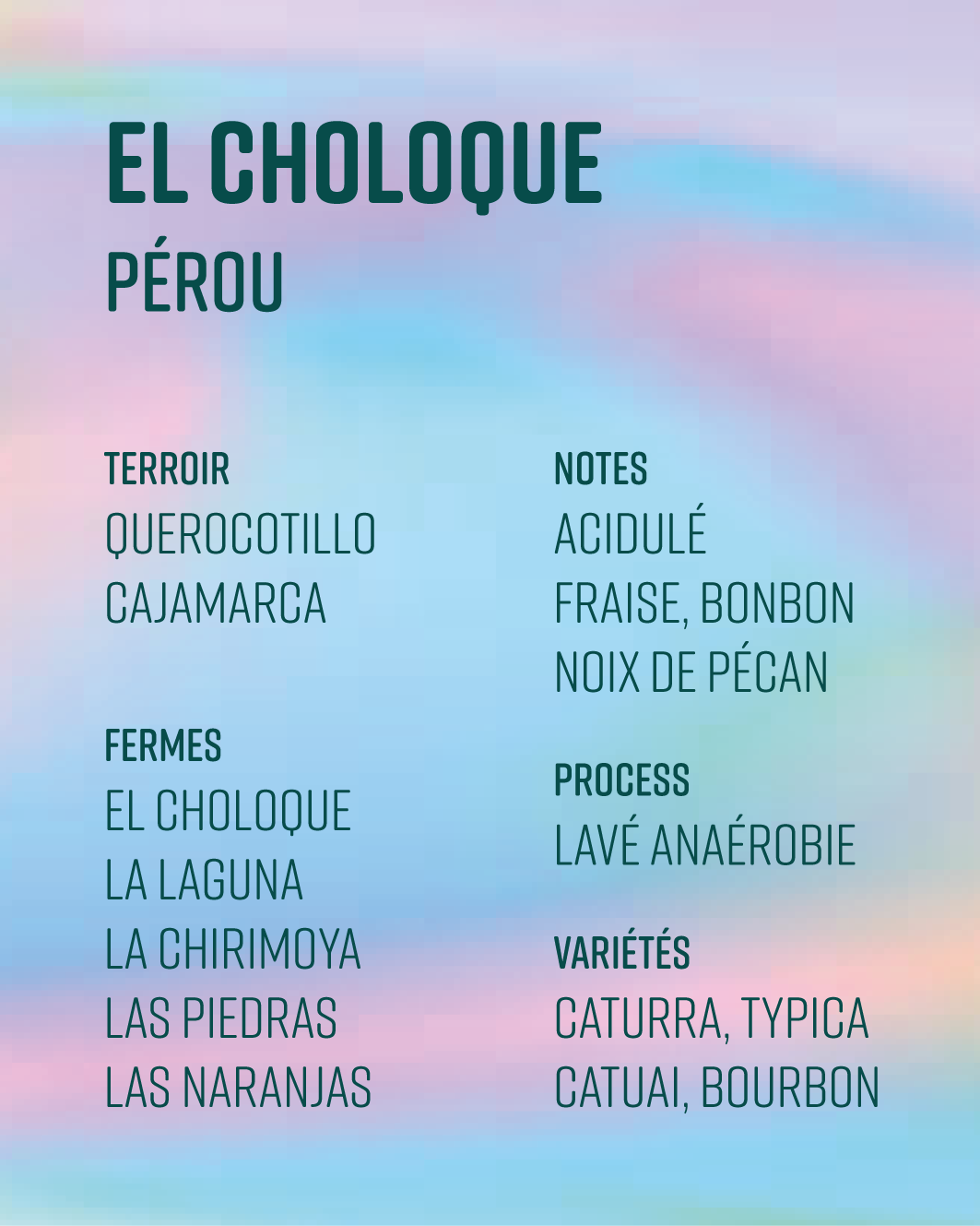 Ce café est un micro-lot issu de cinq fermes : El Choloque, La Laguna, La Chirimoya, Las Piedras et Las Naranjas, toutes membres de la coopérative Rutas del Inca.