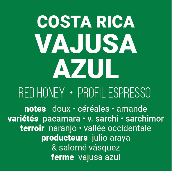 Julio Araya et Salomé Vásquez sont installés depuis une quinzaine d’années sur des sols volcaniques du district de Naranjo, dans la Vallée occidentale. Ils ont très tôt décidé, pour leur ferme Vajusa Azul, d’investir dans des techniques innovantes tout en défendant une approche plus respectueuse de l’environnement. C’est dans cet esprit que le process red honey a été choisi, afin de réduire la consommation d’eau de l’exploitation tout en maximisant la qualité gustative des cafés récoltés.